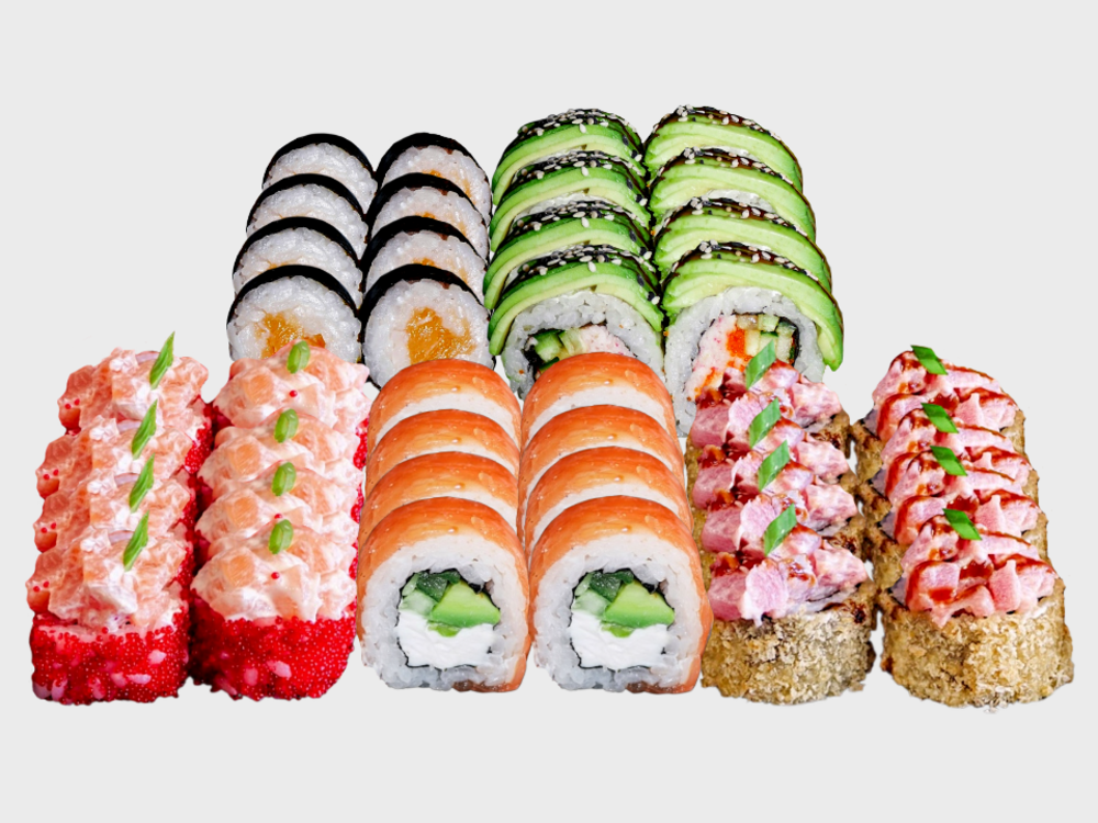 Dragon. Зелений дракон. Філадельфія з лососем. Філадельфія з вугрем. Філадельфія з тунцем. Макі з лососем. Каліфорнія з темпура креветкою в ікрі. Запечений з крабом у кунжуті. Темпура з лососем. Запечений з лососем в ікрі.Вага: 3кг