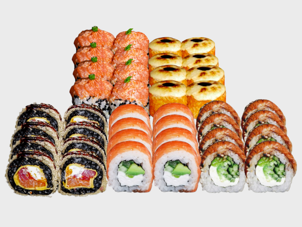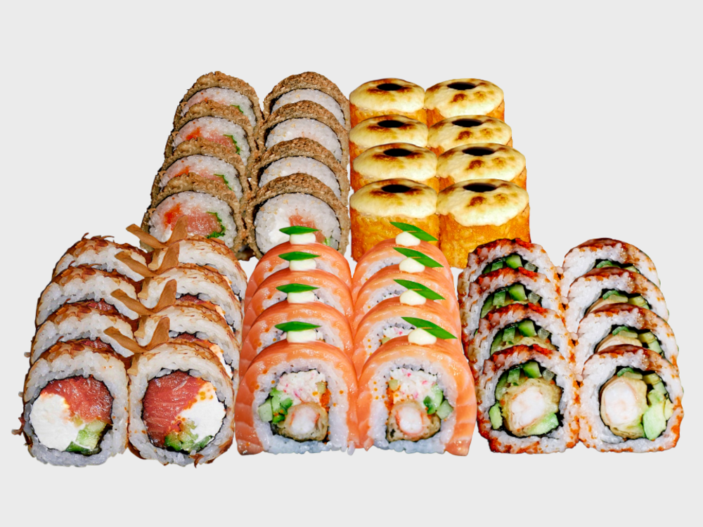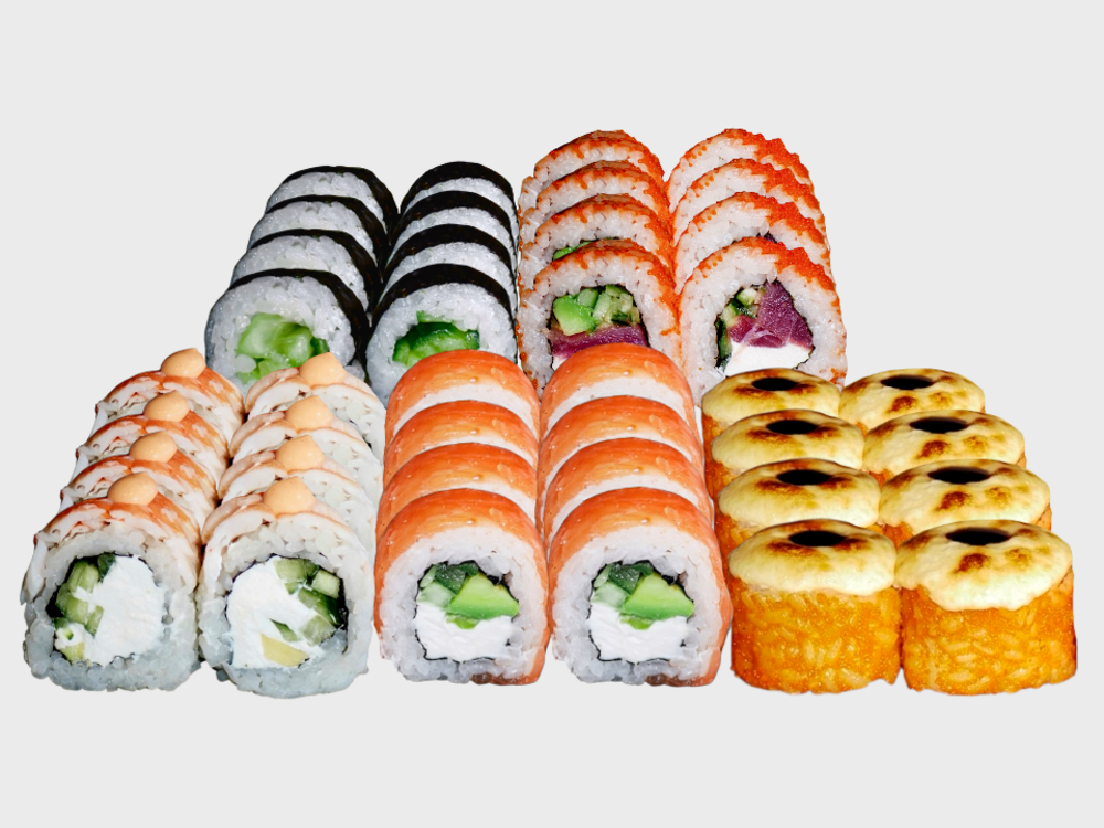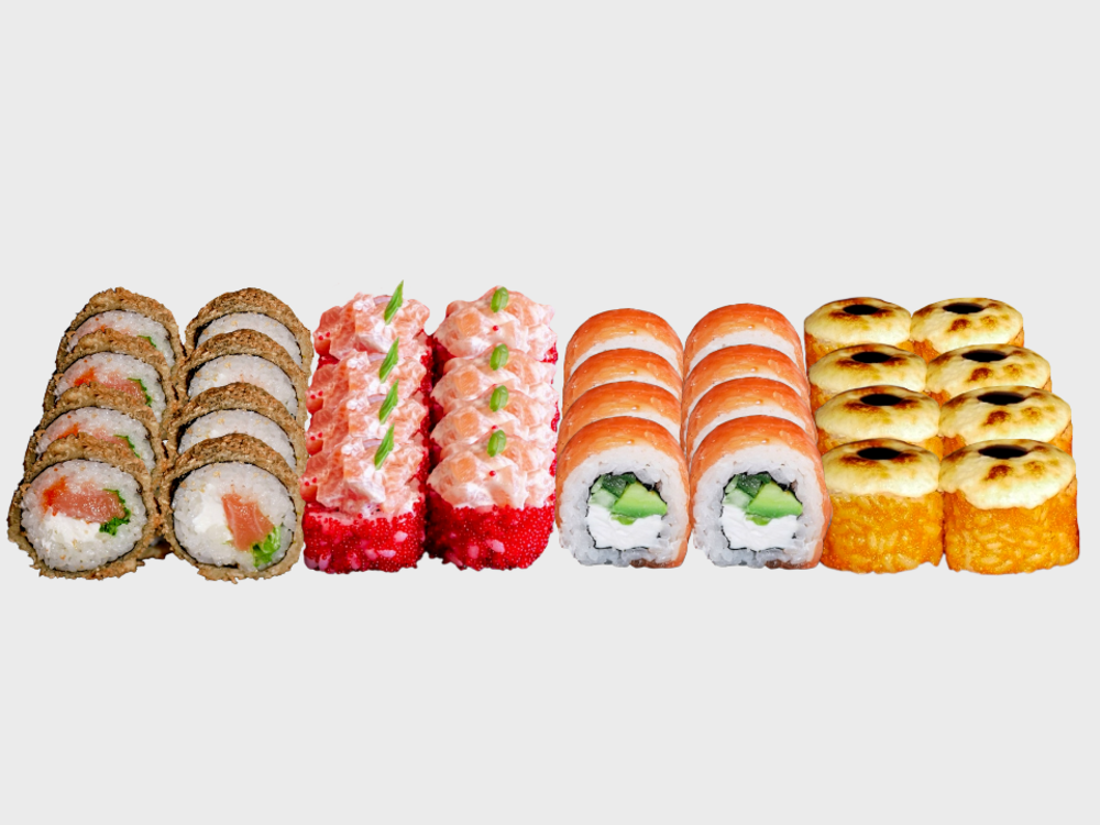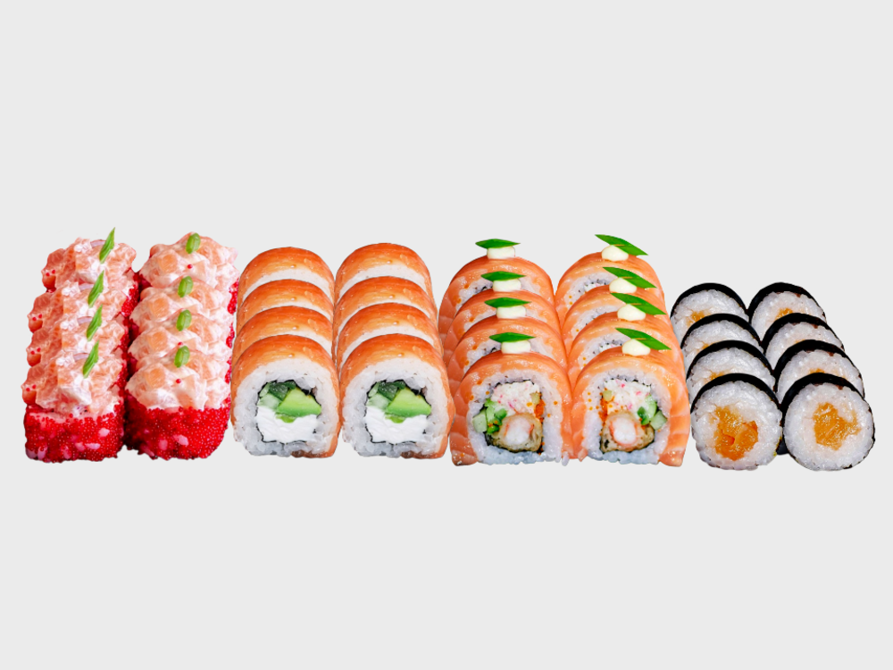 Філадельфія з лососем. Філадельфія з вугрем. Боніто з копченим лососем. Dragon. Запечений зі смаженим лососем в ікрі. Запечений з креветкою в ікрі.Вага:1,8кг