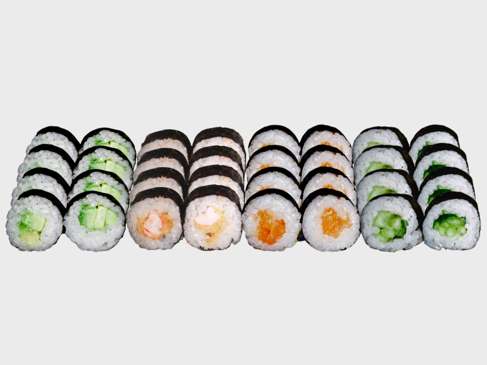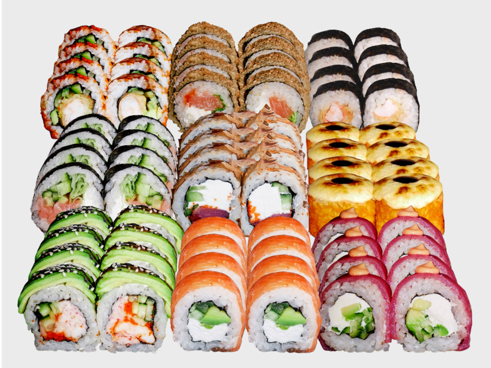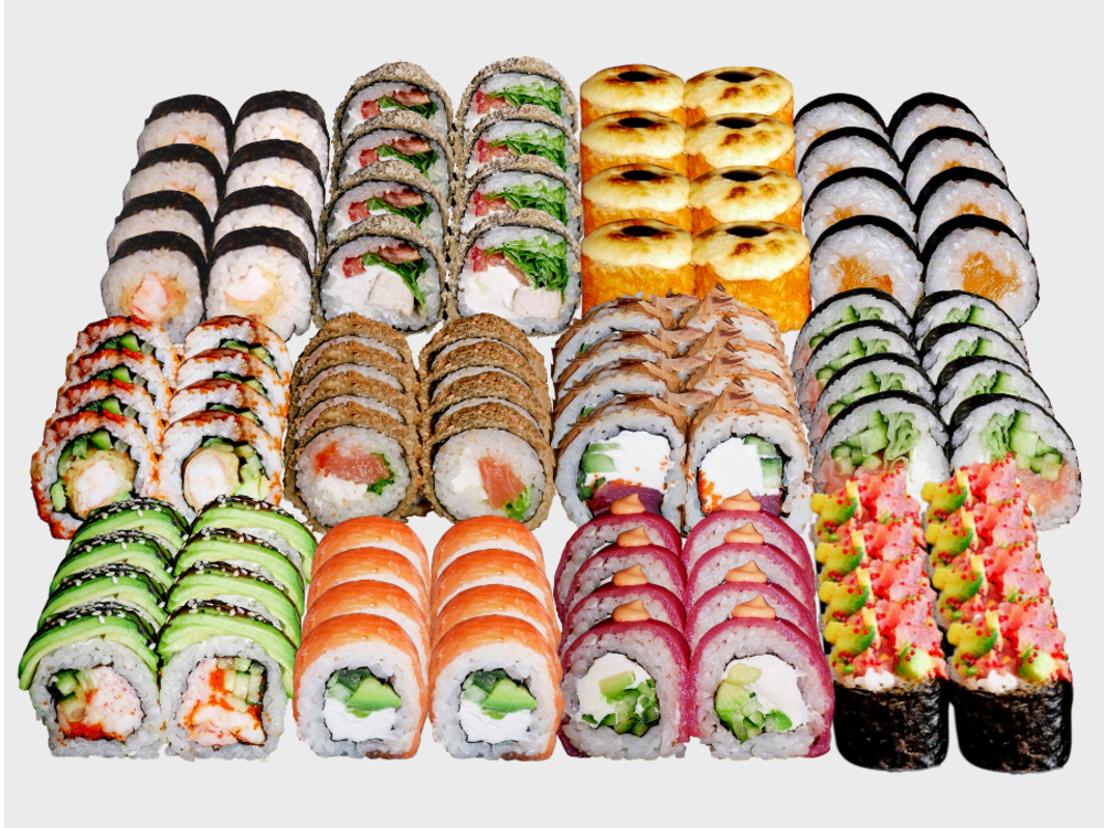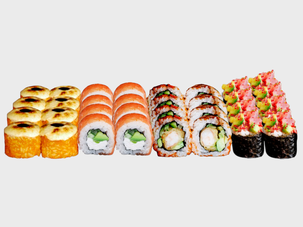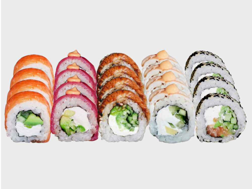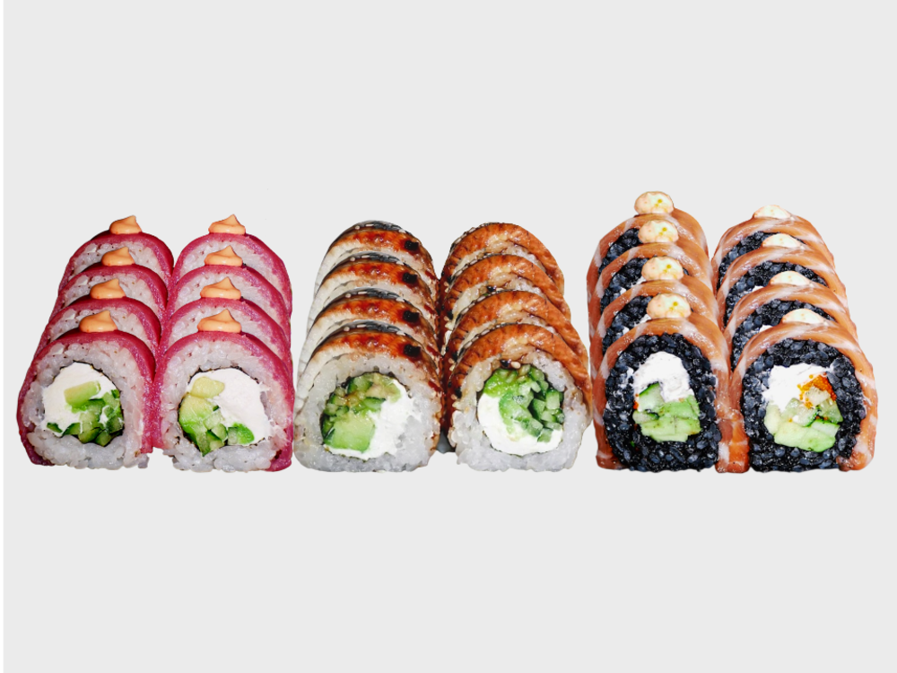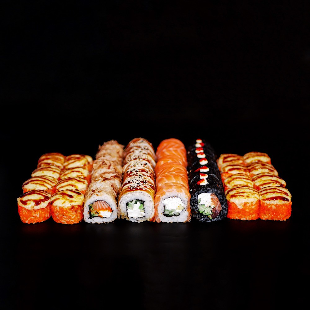 Зелений дракон. Філадельфія з лососем. Філадельфія з тунцем. Боніто з тунцем. Каліфорнія з темпура креветкою в ікрі. Футомакі з копченим лососем. Макі з темпура креветкою. Темпура з лососем. Запечений зі смаженим лососем в ікрі.