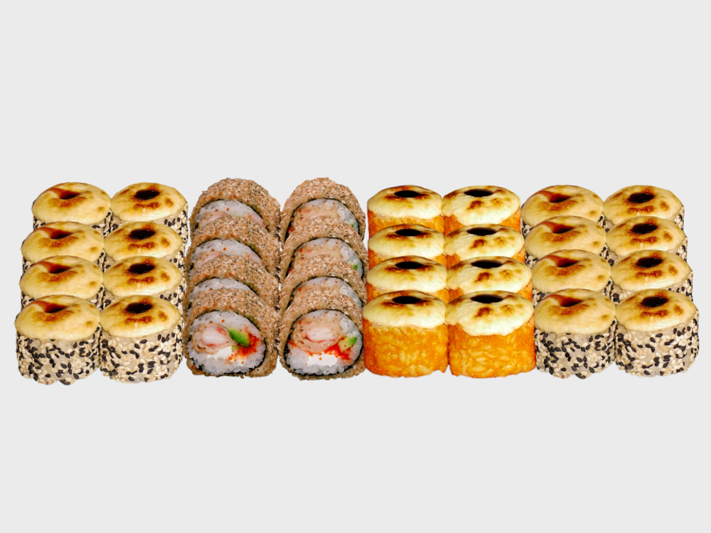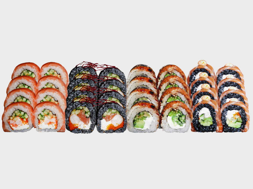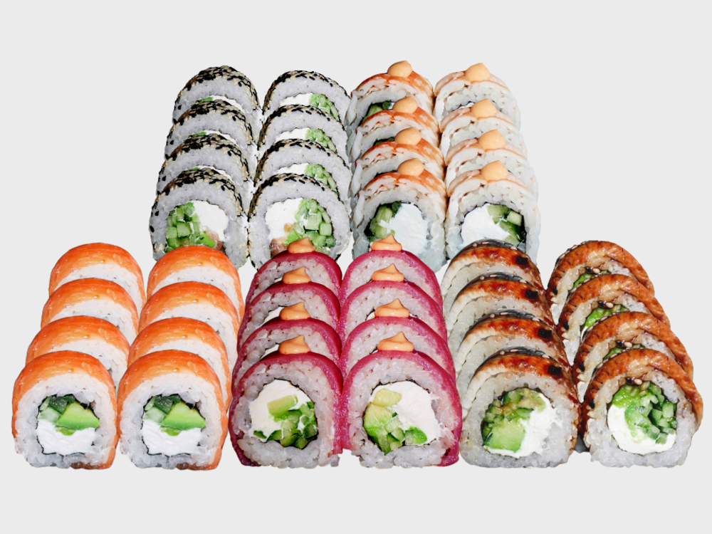Філадельфія з лососем. Філадельфія з тунцем. Філадельфія з вугрем. Філадельфія з креветками. Філадельфія з лососем у кунжуті.Вага: 1550г
